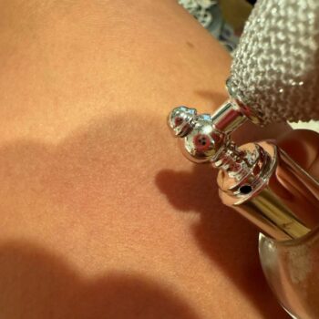 It's a subtle yet beautiful shimmer that evokes a sense of nostalgia, reminiscent of youthful days. Suitable for individuals of all ages, from kids to grown women, who desire a delicate touch of shimmer. The product comes in a small spray bottle with a vintage-style pump, giving off a retro vibe reminiscent of the shimmering necklines popular in the early 80s. I personally adore it, especially the gold/tanish shade I purchased, which features microscopic shimmers that catch the light beautifully.