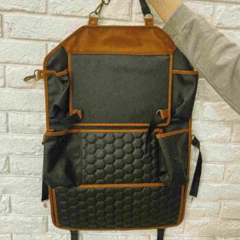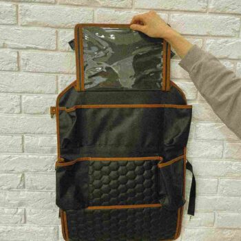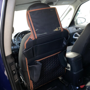 Crafted from smooth eco-leather, this seat organizer is waterproof and easy to clean with a damp cloth. The clear TPU pocket is also waterproof and safe for babies. All the materials used are vegan and non-toxic.