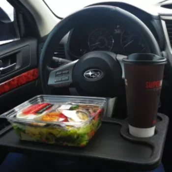 Measuring 11 inches across the steering wheel hold, our tray snugly fits the steering wheel of most modern cars. No balancing on your knees or anything. Whether you’re watching a movie to kill time or are finishing up a weekly report for work, our tray will support you until the end.