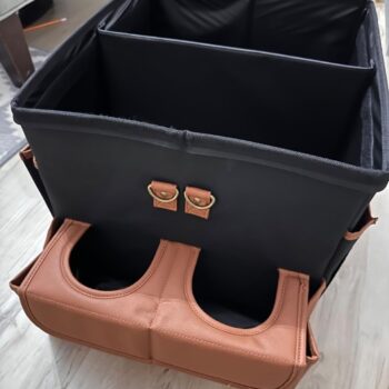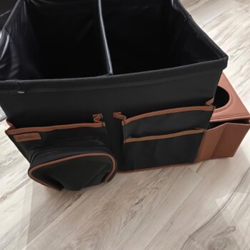 I bought two of these, and I'm planning to give one to my daughter. It feels strong and durable, and for now, I have my wipes, sunglasses, and tissues in it. It can also hold drinks easily and sits nicely on the seat. I like that I can rearrange the compartments to fit whatever I need to put in it.