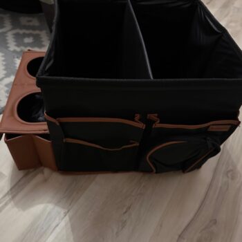 Large compartment with a removable divider, eight side pockets and two front pockets can hold everything you need on the road – from drinks to gadgets. It is suitable for all car models, and you can use it in your front seat, back seat, or even in the trunk. Plus, the lid works as a backseat table!