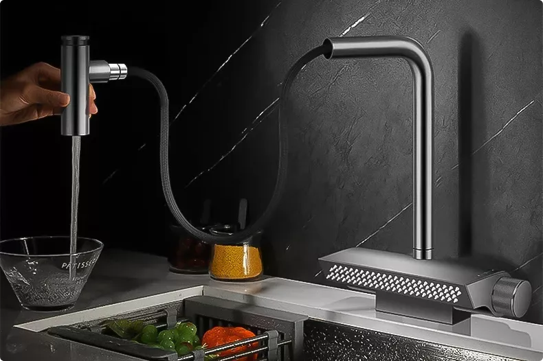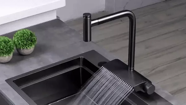 Upgrade your kitchen’s functionality and style. With our Contemporary Black Brass Waterfall Kitchen Faucet with Pull-Out Sprayer, experience the perfect balance of design and utility. Don’t wait—make it the cornerstone of your kitchen now!