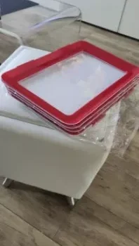 Our trays are made of polypropylene plastic, with the wrap being advanced elastic film. All trays are white with a red border frame for the film cover. Each tray measures 9 x 12 x 1.14 inches (L x W x H).