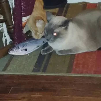 I gave Hope the fish cover while charging the battery at my computer! She enjoyed playing with it and I think it helped her feel comfortable with it on the initial introduction. The part I appreciated most about it was that she spent time playing in the living room it while my boyfriend and I were sleeping. We usually keep her in the room with us because she tries to jump places she’s not allowed, but she had her fill of the fish, and then came and napped with us. It keeps her company! She’s a little co-dependent, so I think it’ll help her when we go back to work. I like to imagine when she played with it without the motor, and then I put the motor in, she was mind-blown and wondered how it suddenly came to life X)
