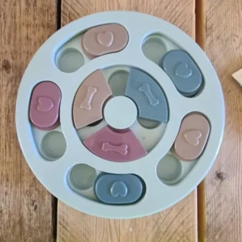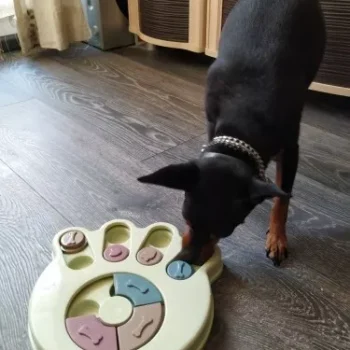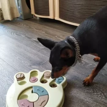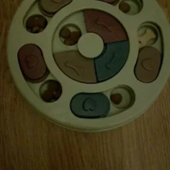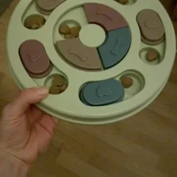 My little dog basically sat in the middle of this and then took a nap. He had no interest in this. I gave it to my daughter who has a medium size dog. He went to town trying to get the treats out of the puzzle. He could move the pieces and eat up. There are some extra pieces in case one breaks. You do have to screw them in from the botton to keep them in place correctly.
