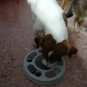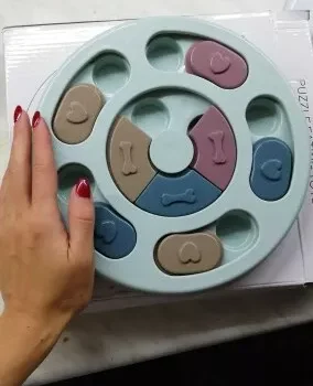 So my dog is a confirmed genius- just kidding but she solved this in less than a minute. I thought about getting a more complex puzzle but thought I’d try this one out first in case she wasn’t a genius. The only negative aspect of the product is that if your dog chews up toys she will probably chew up the puzzle pieces. So this is a puzzle I’d recommend using if you are home with your pet. I’ll look for another one to use when I am gone to keep her busy mind occupied.