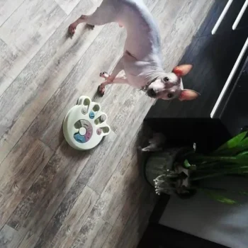 I wasn’t sure if my dog would have anything to do with this. I put treats in it and set it by my dog’s bed. I adopted him after he was rescued from a hoarding situation so he really hasn’t had toys to play with. I’ve had to teach him how to play with them. I noticed the freebie treats were gone one day and checked the rest of the puzzle. All gone! I was amazed. Filled it back up and left it for a few days. Empty again. Now I’ve watched him do it and it’s so funny. I’m going to try to get a video of it. He’s a 15lb chiweenie. Half chihuahua half dachshund and much smarter than I gave him credit. lol