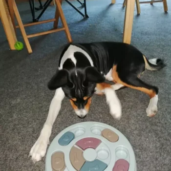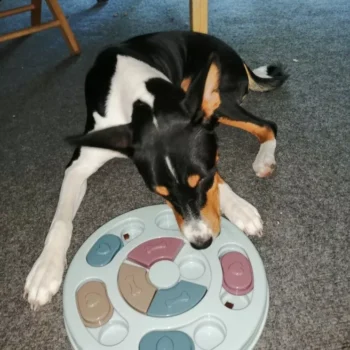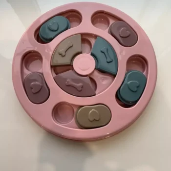 My Border Collie, Grace, just loves this "toy." Dogs like Grace need constant mental, physical, and emotional stimulation and this thing helps for a few minutes in the evening. She has learned to check index every one, looking for a treat. When she finds one, she not only gets a treat, but she gets our praise. She has learned to use both her nose and her paw to manipulate the rounds. It is well built and heavy enough that it stays in place when Grace is playing with it. Because she still chews everything, after a few games, we take it up off the floor. Wonderful toy and I'm highly recommending.