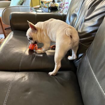 My poodle loves this interactive ball! It's like having a playmate that never gets tired. The chirping bird sound stimulates his curiosity and the two long tails are perfect for tugging games.