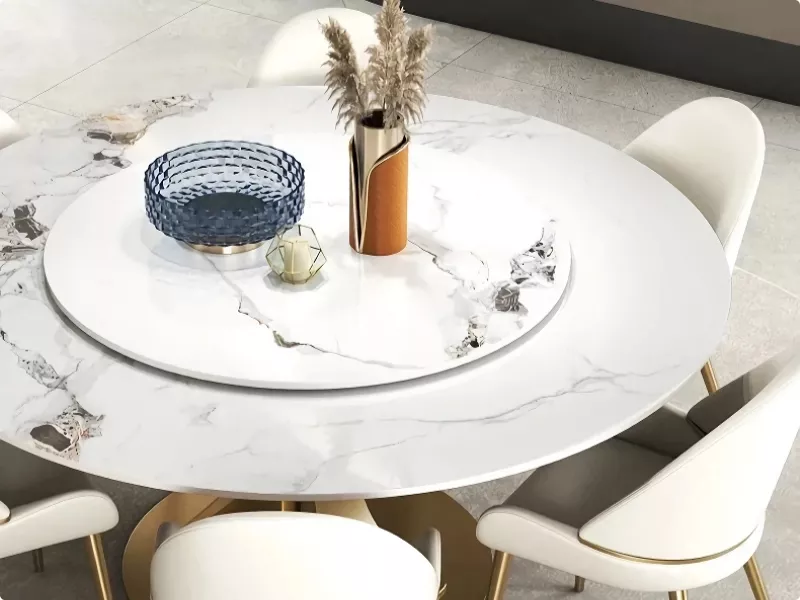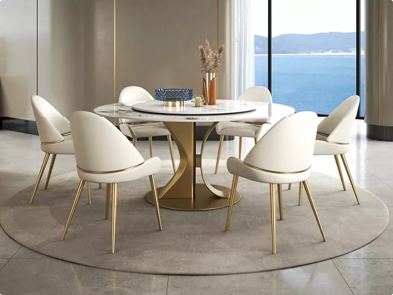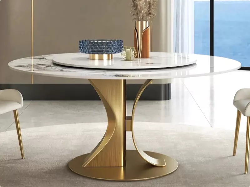 This table shines not only in its fundamental features but also in its ability to enhance the moments that matter. Best used for both daily meals and festive occasions, it turns every gathering into a luxurious banquet. The combination of practicality with the turntable and the unparalleled elegance of the gold stainless steel frame and marble top makes this dining table a unique centerpiece for your home.