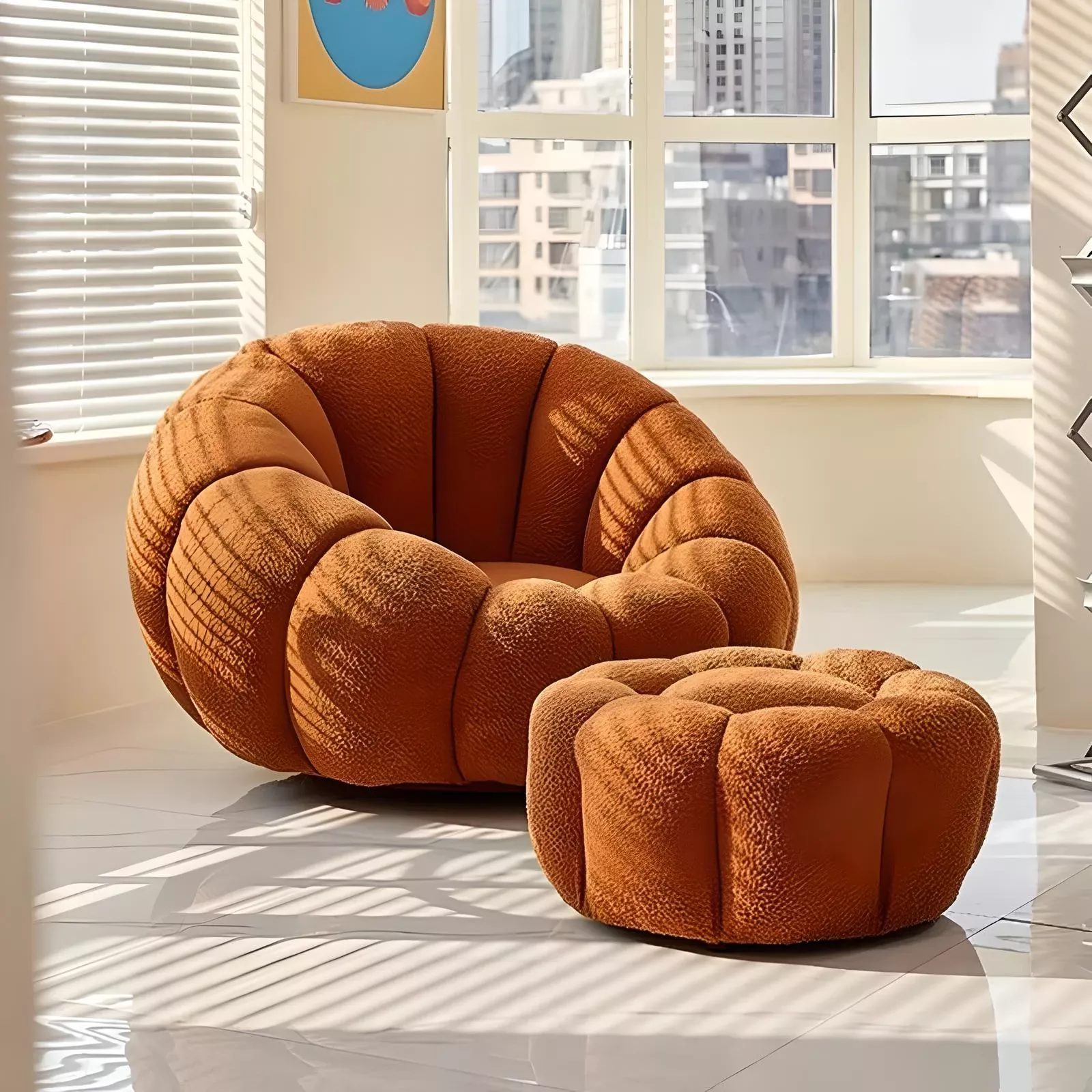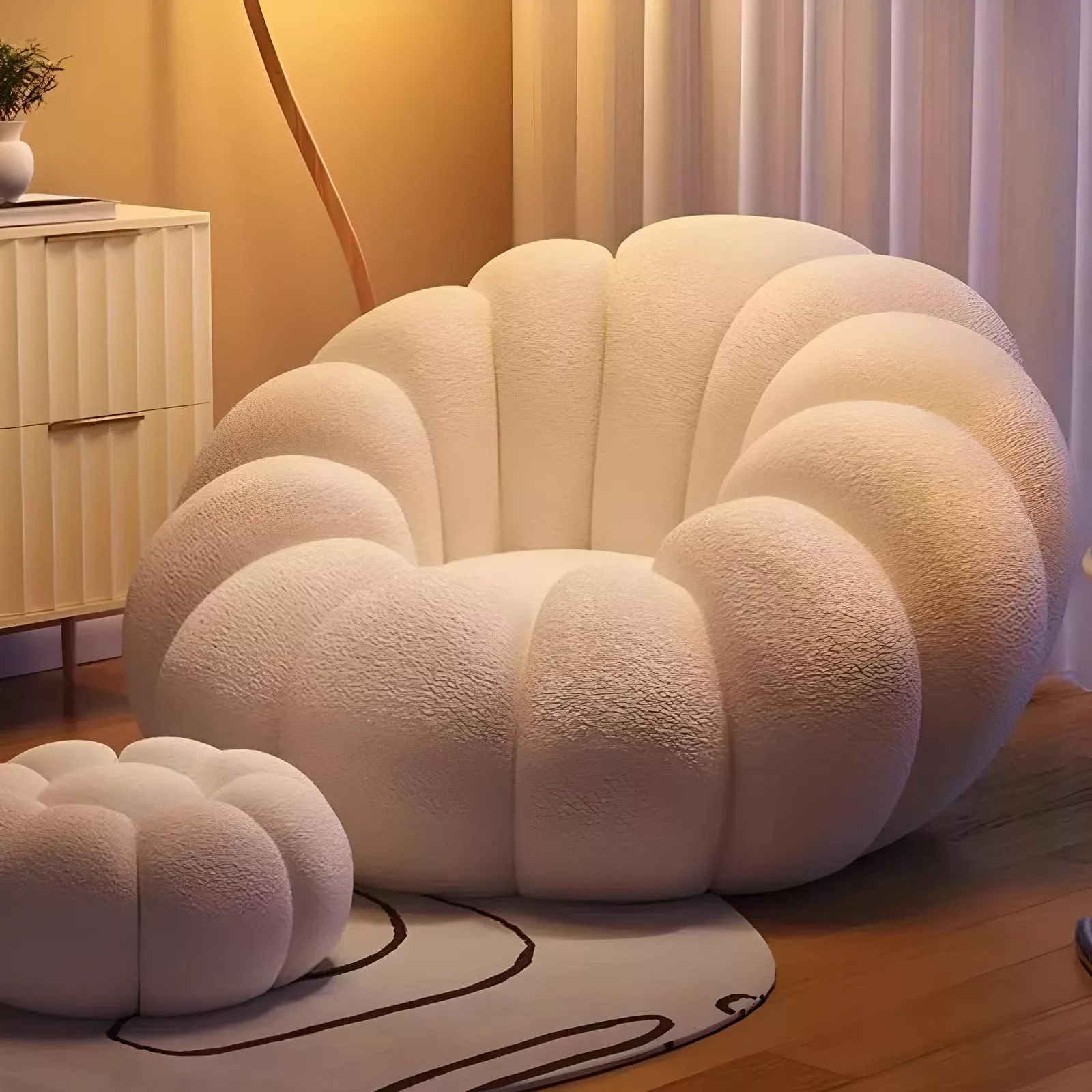 Introducing our Modern Minimalist White Velvet Lazy Sofa, a perfect blend of style and comfort for your living space. Designed to add a touch of elegance and coziness to any room, this chair is not just a piece of furniture, but a statement of modern living. Its unique pumpkin shape and plush lamb cashmere fabric invite you to relax and unwind in its welcoming embrace.