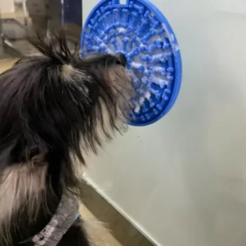 Really the best thing for grooming your dog! We use this for the bath, drying, brushing, giving eye drops, etc. Has really changed our experience with grooming our dog who used to hate baths and he's so much happier too! Only thing is to make sure you watch your pup the full time while licking peanut butter or whatever you put on the slow feeder... We left him after grooming to finish up his peanut butter and he bit a piece of the plastic off and ate it. We learned for next time! Highly highly recommend!