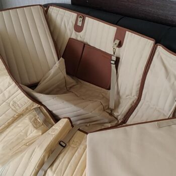 Featuring our branded beige and brown colors, this car hammock includes leather accents and a sleek geometric pattern. It integrates seamlessly into any car interior, offering protection with a stylish touch.