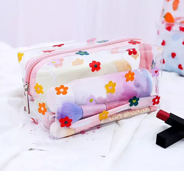 What sets our cosmetic bag apart is its unique blend of practicality and trendiness. The transparent design not only adds to its stylish appeal but also offers the convenience of seeing your products at a glance. The adorable strawberry flower print is sure to catch eyes and elevate your style quotient.